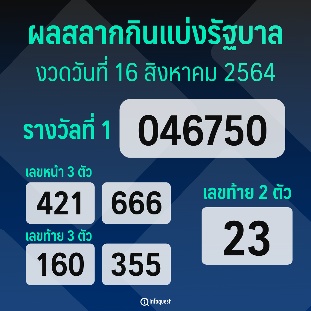 ผลสลากก นแบ งร ฐบาล งวดว นท 16 ส งหาคม 2564 อ นโฟเควสท
