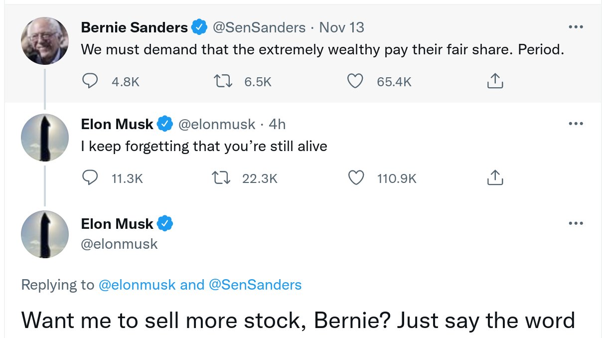Der 80jährige US-Senator Bernie Sanders erneuert seine Forderung dass Reiche ihren gerechten Anteil zum Gemeinwesen beitragen sollten. Heres what you should know. Elon Musk in a recent spat with Bernie Sanders on Twitter over paying taxes offered to sell more Tesla shares.